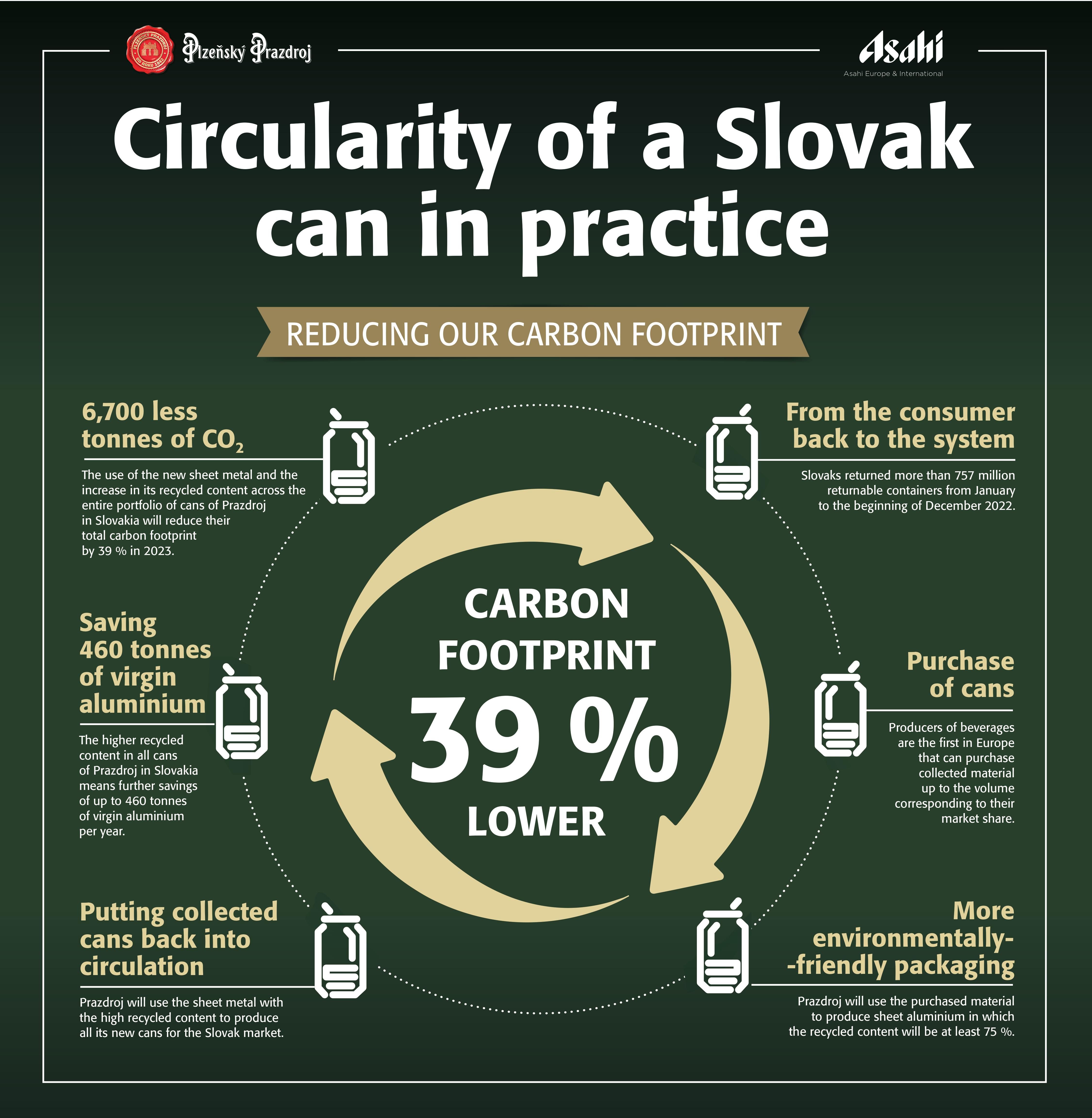 A deposit return scheme in Slovakia offers beverage producers including Plzeňský Prazdroj Slovensko (part of Asahi Europe & International) the opportunity to purchase collected cans to recycle them and make them into new ones. It is the first scheme of its kind in Europe allowing producers this option. Today, we are proud to be part of this scheme that allows us to close the life cycle of our cans. From 2023, we will increase the share of recycled content in the body of our cans to 75% across full portfolio.